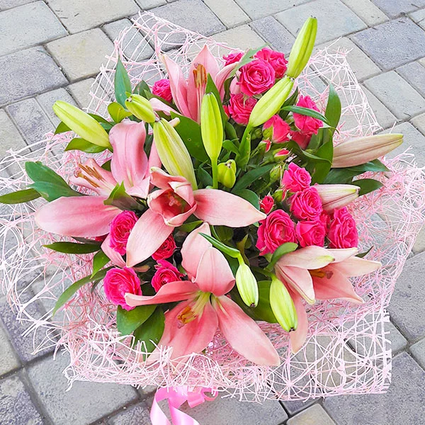 Стандартный (на фото): лилия розовая (возможна замена на белую) - 2 шт., роза розовая - 3 шт., натуральная упаковка - розовая.